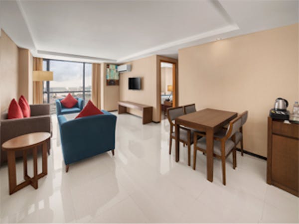 The room has a total floor size of no less than 538 ft². Unlike the two Deluxe accommodations, the Suite Room provides magnificent city view which is especially stunning at night. It also has an added sofa set to give guests' the ultimate comfort they need after a long busy day.